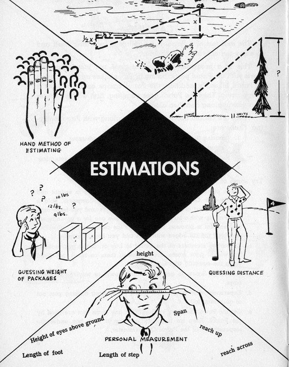 Let's look at that tree again. How many methods of checking can your Patrol do? Pencil method? Shadow method? Napoleon method? Lumberman's method? One-in-twelve method? Don't restrict yourself to trees! Try towers, poles, cliffs, buildings and steeples. Set up a course with 5 or 6 objects. Have each Scout estimate height. Then, as a Patrol, check them by one of the methods mentioned above. Use the same idea for rivers, fields, fairways, roads, rooms, etc. On a Patrol hike, try to estimate distances before covering them. This is good practice for keeping logs on First Class hikes. Ever wonder how many people are in a crowd? Try covering an area with your hand fully outstretched. Estimate or count the number in this area. Multiply by the number of portions required to fill in the whole crowd. Practise with numbers of stones, beans, etc. Make a game of it. Estimating weights can also be fun. Ever see the man at the fair? He is usually accurate to well within the 10% allowed in estimations. This, again, is done by practice. Get your parents or leaders to set up a group of similar-sized packages of various weights. Run a competition for the Patrol. Best estimator to get the contents of one - nuts or candies. Remember - the difference between a "guesstimation" and an "estimation" is practice. |